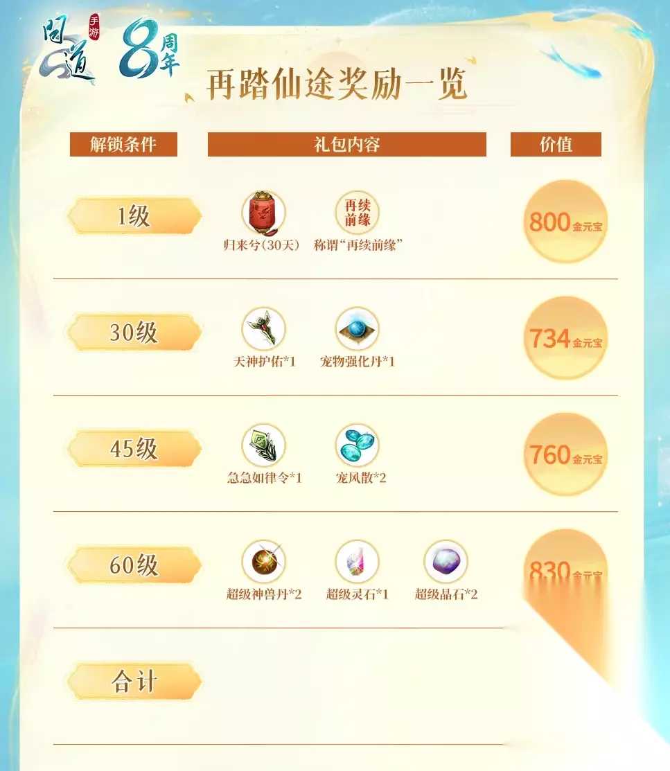 再踏仙途: 回归道友首次创角,达到特定等级可开启礼包!礼包价值总计达3124元宝!