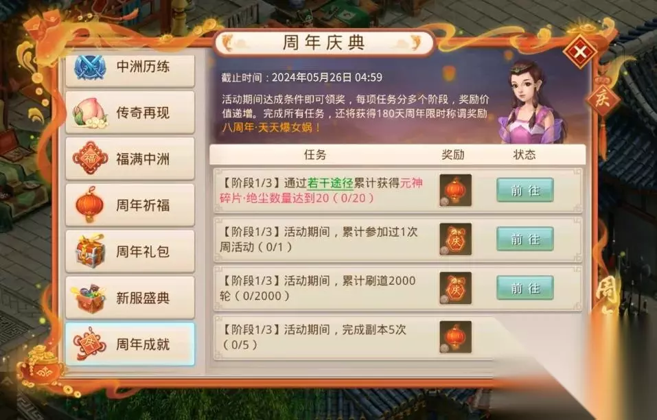 周年成就 : 做任务,赢奖励!还能得周年专属称谓奖励【八周年·天天爆女娲】(180天)!