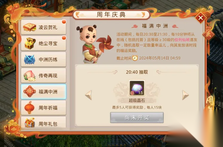 福满中洲: 活动期间的每天20:30至21:30,每10分钟将会送出一波福运好礼,包括女娲石、天倾石、召唤令·十二生肖 、召唤令·上古神兽等,共计7轮。