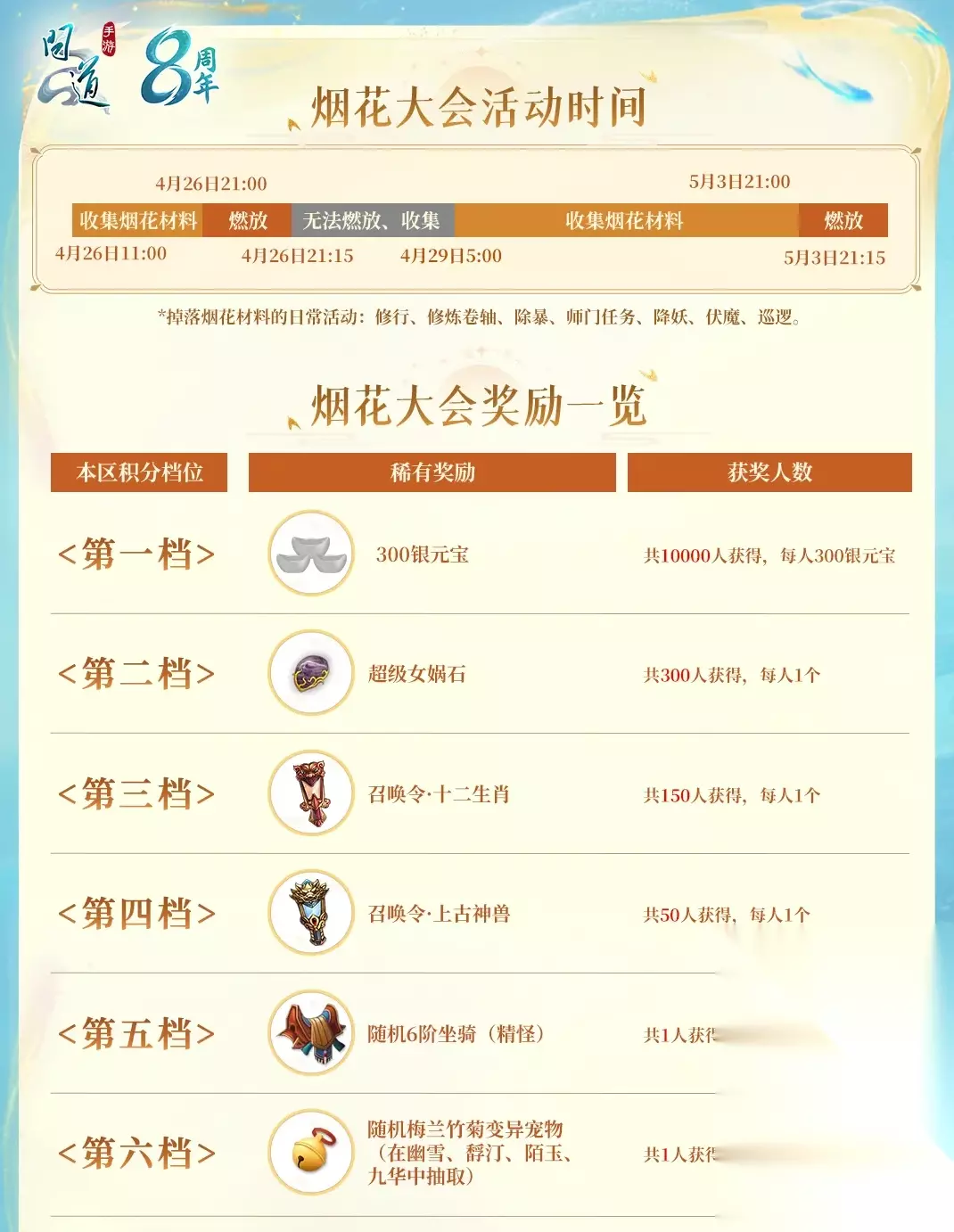 想参与活动拿奖励的道友们记得收藏这篇,随时来看~ 8周年更多爆料即将放出,关注《问道》手游论坛/社区获取一手爆料~