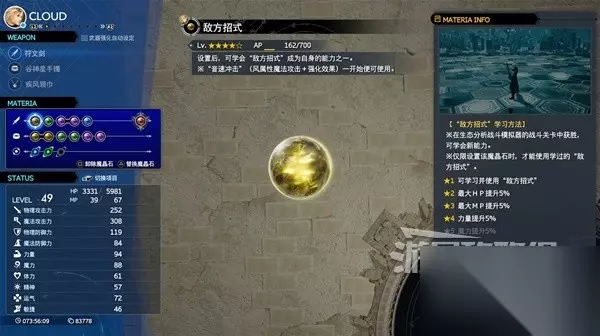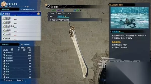 《最终幻想7重生》这套放电流构筑在最高难度也能超高效率的清理效果,就算遇到BOSS也完全不虚,下面为大家带来《最终幻想7重生》克劳德电浆放电流构筑攻略,其中详细介绍了此构筑的所有要领,希望能帮助到大家。前言 1、本构筑以魔晶石:敌方招式的电浆放电能力为核心,其他装备的作用皆在提供角色在战斗中可以获得的ATB值的量。 2、电浆放电能力只要ATB值一满就会释放大范围的电圈攻击,配合符文剑的技能无序猛攻可以不断的打出高额物理伤害与放电伤害。 3、并且这套构筑的所有部件都可以在前中期获取,让你不再惧怕后续章节的猛堆怪。武器符文剑 符文剑能力无序猛攻可以让你在命中敌人时就获得特定的ATB值,并且可以让你在战斗中打出高额的物理伤害。 在武器熟练度打满后就算换别的武器也可以使用无序猛攻能力。