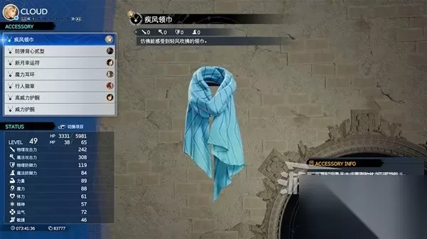 在第四章扮演士兵时获得,详细获取教程:点此查看。配件疾风领巾 疾风领巾可以在战斗一开始就为你提供一部分的ATB值,可以加快你使用电浆放电的速度。