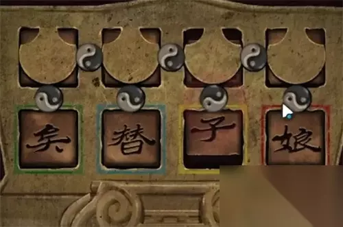 7、然后打开祭祀台右边的书柜,按照上面的提示调整香案上面的字,详细摆放情况如下。