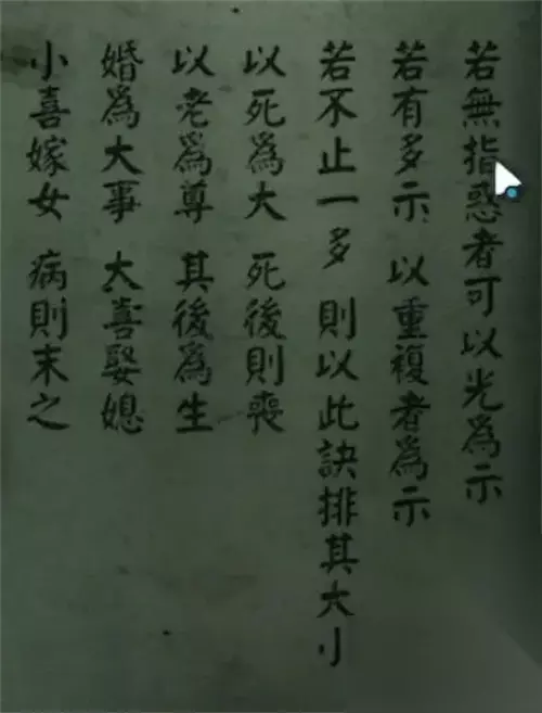 32、旱烟袋点燃白色的蜡烛,然后根据线索调整桌子上寿桃的位置。 33、打开祠堂左边的门进入可以看到7个小人,利用牌子上的字进行组词。