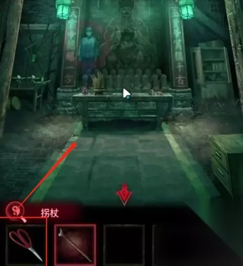 19、获得了线索以后切换成男生视角回到祠堂,打开右下角柜子能够得到一个凿子。