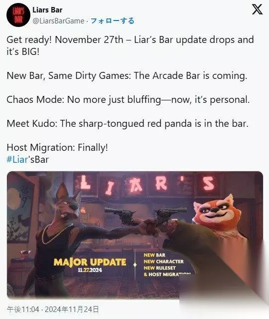 开发商Curve Animation今日宣布,备受欢迎的桌面游戏《骗子酒吧(Liars Bar)》将于当地时间11月27日迎来一次重大更新,其中包括新阶段、新头像以及新规则集的引入。