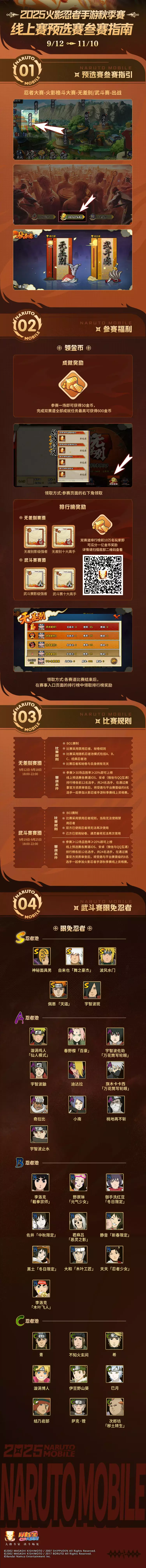 随着2025《火影忍者》手游秋季赛无差别预选赛的结束,武斗赛预选赛正在进行中,即日起-9月25日每晚18:00-22:00,全体学员踊跃参赛即可领取金币、赛事专属头像框等丰富奖励~本次武斗赛限免忍者池还新增了不少忍者,学员们想选择哪些心仪的忍者上阵呢?点击下方查看豚豚整理的参赛指南,就能快速了解参赛方式、比赛规则、武斗赛限免忍者池等赛事详情信息啦!