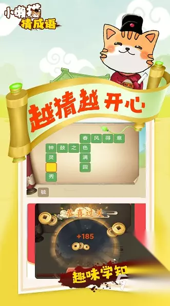 它把成语玩出了新花样,针对不同的类型成语制作,出了精心设计的图字结合。每张图都紧扣成语的意思,一看就懂。背景设计的古香古色,让人仿佛穿越回了古代。关卡的内容特别丰富,学成语的同时还可以增长见识,这款游戏可以多人一起玩,大家进行比拼,看谁猜得又快又准,在这里不仅能享受猜谜的乐趣,还可以和朋友一起互动增进感情。 手机扫码下载233乐园APP预约 预约订阅最新动态 优先233乐园APP下载 7、《小懒猫猜成语》