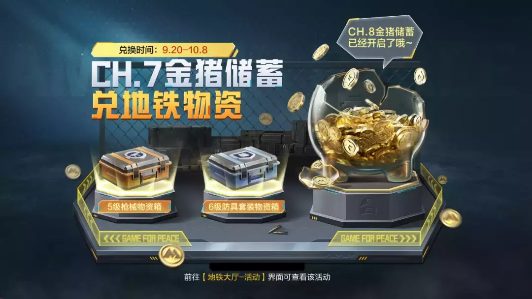 11月21日CH.9赛季开启后,可在活动界面消耗金猪币兑换5级枪械物资箱、6级防具套装物资箱等地铁物资奖励!