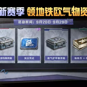 9月20日~9月29日,完成指定任务将获得进度值,达到指定进度值即可领取:欧气护甲物资箱×1、突击凭证×1、欧气背包物资箱×1、地铁币×666666等奖励!