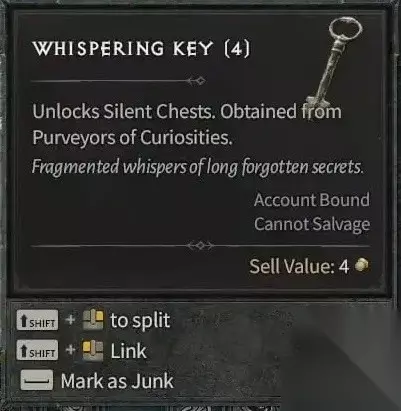 可以在珍宝商处购买“低语钥匙”,用来解锁野外的“沉默宝箱”。 可购买物品清单 在珍宝商处可以用几个低语古币的小价钱,来购买强大的稀有和传奇物品,并且物品的质量将随着角色等级的提高而提高。下面列出各种物品的价格: