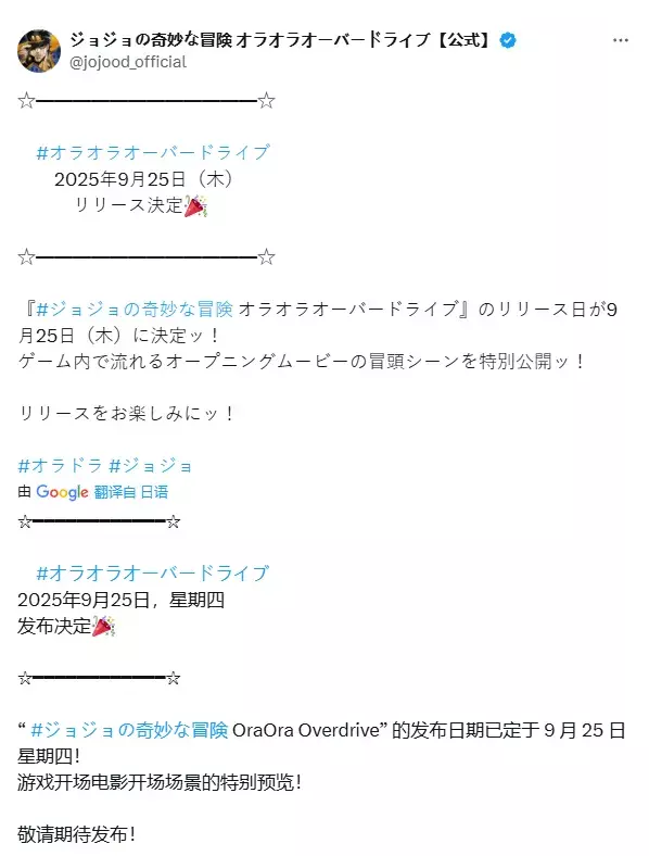 《JOJO的奇妙冒险》IP手游新作将于9月25日海外上线,目前已开启海外预约。将登陆海外安卓和iOS平台。