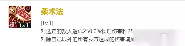 【必杀】 柔术法 对选定的敌人造成250.0%物理伤害和250.0%近战攻击伤害,对除自己以外的所有友方造成的伤害增加14.0%【2回合】
