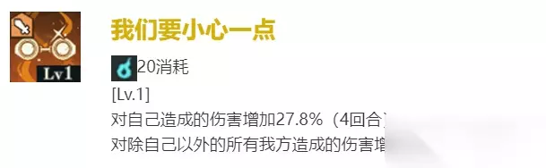 我们要小心一点 对自己造成的伤害增加27.8%【4回合】 对除自己以外的所有我方造成的伤害增加20.9%【4回合】查看升级效果