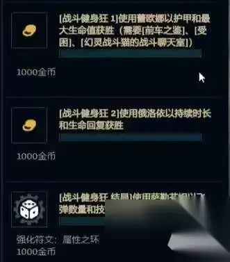 1、战斗健身狂 1 任务:使用蕾欧娜以护甲和最大生命值获胜(需要前车之鉴、受困、幻灵战斗猫的战斗聊天室) 奖励:1000金币 2、战斗健身狂 2 任务:使用俄洛伊以持续时长和生命回复获胜 奖励:1000金币 3、战斗健身狂 结局 任务:使用萨勒芬妮以飞弹数量和技能急速获胜 奖励:强化符文:属性之环、1000金币