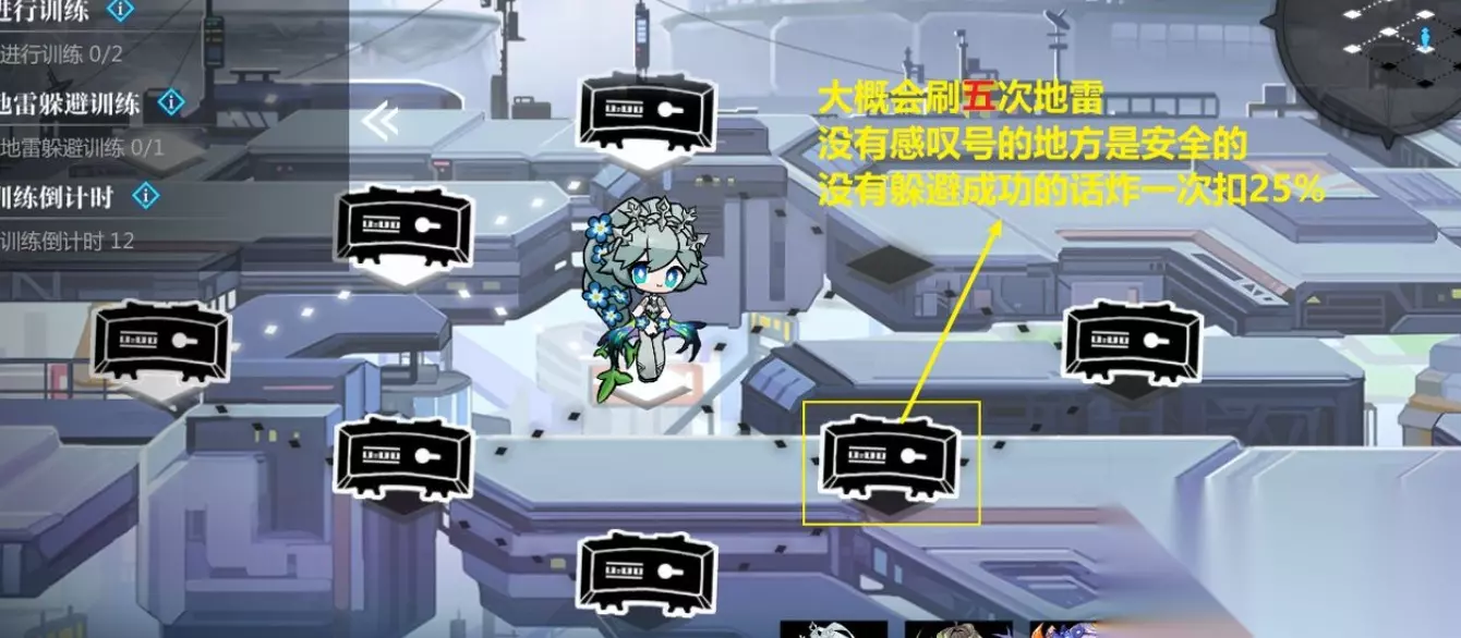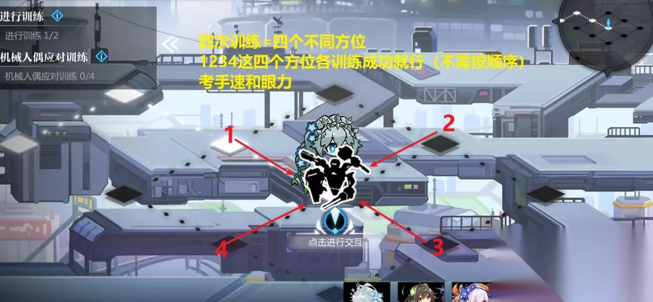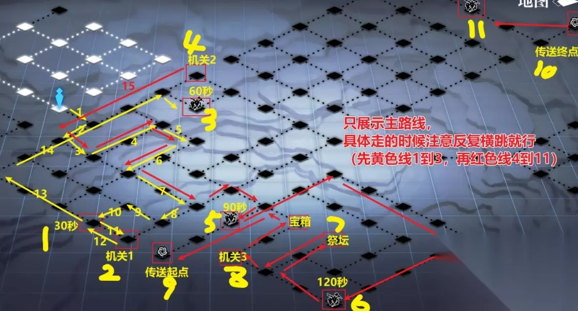 重点:30秒、60秒、90秒、120秒、150秒的按顺序打,时间是够的,战斗不算在计时内,建议规划好路线做好准备再打。 注意自己反复横跳!!(因为前面训练1和2你走的步数会影响这里巡逻怪的位置,每个人的巡逻怪位置不一样,不能以偏概全,所以这里只给主路线,具体躲避巡逻怪需自己反复横跳一下!