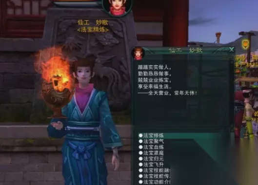 3、之后去地图上寻找NPC【仙工妙歌】,对话中选择【宝物血炼】就可以开始放法宝了;