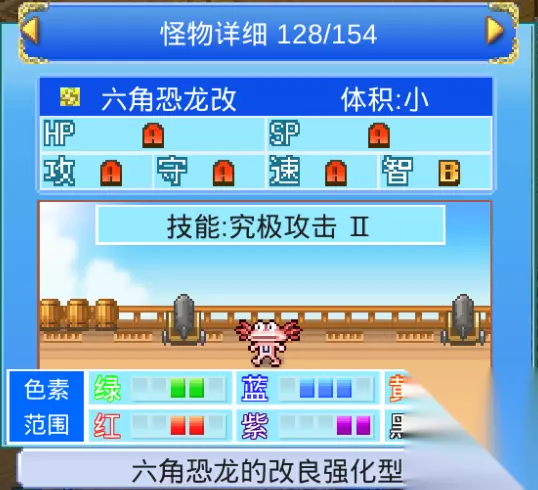 六角恐龙改好处都有啥 作为一个S型的宠物,却有着不输一些L型宠物的实力。而且,S型宠在前期更容易进行觉醒,性价比很高。 在全部S型宠物当中,六角恐龙改的属性也就比骨子船长改低一点。但是六角恐龙改的技能是究极攻击(战斗中几率攻击敌方全体),在讨伐、刷材料、打低级本的时候有着很高的效率。所以,六角恐龙改可以说是刷刷刷的必备宠物! 附:S型指小型宠物,M型指中型宠物,L型指大型宠物。 获取方法 六角恐龙改的获取方式有两种。 1、直接通过神签获取。(神签在宠物牧场总等级12级时开启) 因为神签获得的宠物均为50级,所以我们不用担心宠物会成长成别的物种。(50级之后不会成长) 2、通过成长获取。 之前成长顺序表小编有提过,每一种宠物最多在出生形态下成长两次。由于六角恐龙改并不是无法成长的宠物(有一次成长机会,可成长为炽热魔人改),所以,除神签之外想获得六角恐龙改的方法就只有一种——孵化编号103的贝贝子改。贝贝子改成长两次后会变成六角恐龙改。为什么不孵化闪闪贝改呢?因为闪闪贝改可以成长两次,第一次在25级成长为六角恐龙改,第二次在50级时会成长为炽热魔人改。 贝贝子改孵化方法 前期准备: 1、一星蛋和二星蛋若干(商业岛13体力图可以刷1星蛋(体力消耗最少))(二星蛋可以在阿里琴大陆(第二张图)中的暖和岛20体力的副本、第一张地图的不思议之岛18体力副本获得) 2、材料准备蛋蓝提升两个、蛋紫提升一个,蛋红抑制,蛋绿抑制各一个,蛋催光(前面的都可以推荐商店购买),玉米一个。如果是用一星蛋孵化,额外需要一个才能提升药。 一、一星蛋孵化方法 因为是一星蛋,我们需要一个才能提升药。然后加入一个蛋绿抑制,一个蛋红抑制,2个蛋蓝色提升,1一个蛋紫色提升。因为一星蛋只能加入五个材料,色素范围较难控制,会有多种宠物出现。 二、二星蛋孵化方法 加入蛋红抑制、蛋绿抑制、玉米、两个蛋蓝提升,一个蛋紫提升。使用蛋催光孵化。(同样会有多种宠物出现) 附:贝贝子改孵化色素表