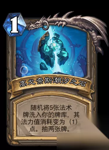 最后一个远古圣物是高戈奈斯潮汐之石: 这是一张1费法术牌,可以将五张随机法术牌洗入牌库,并且让这五张牌变成1费,同时抽两张牌。