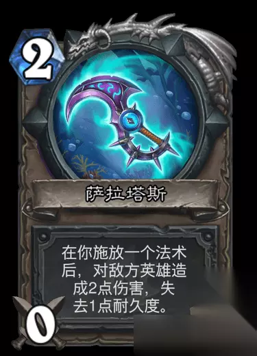 第二个是萨拉塔斯 这是一张费用为2的0/5武器 装备该武器后,每释放一个法术,对对方英雄造成2点伤害,失去1点耐久度,也就是说这把武器可以在1回合内额外爆发10点指向性伤害;