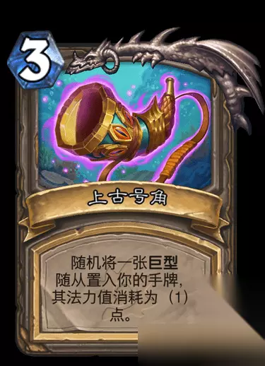 第三个远古圣物是上古号角: 这张牌就有点厉害了,可以将随机一张巨型卡加入手牌,并且变成1费,等于是4费打出一张巨型卡,上限很高。
