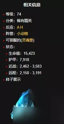 二、基础信息介绍 (1)基础属性 等级:74 分类:稀有精英 反应:A H 阵营:小动物 可驯服的(灵魂兽) 状态: 生命值:15,423 护甲:7,918 近战:2,462 - 3,503 远程:2,150 - 3,191