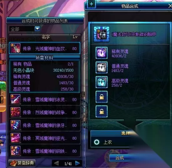 是男人就用枪说话! 点击抽奖 在赛利亚房间,点击赛利亚就可以看到,传承用紫装合成,圣物用粉装(按装备颜色分),粉装,传说合成需要上级元素结晶,灵魂数量可从背包“材料-灵魂仓库”里查询,灵魂账号绑定,分解机等级影响无色数量但不影响灵魂数量
