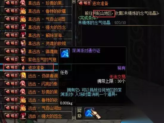 2.搬砖角色每天两次的免费深渊从何而来? 1.巨龙(有个每日叫“进攻准备” 可换一票),巨龙位于月溪镇,不认识路的可以借助一下移动药剂,三个地图,其中双子巨人的背叛的图最短,个人建议要刷材料的刷此地图,攻略可自行百度,在此不做解析 2.挑战任务(每天6个随机任务,完成任意5个即可获得一个深渊票盒子,一般开15张,需要自己领取)