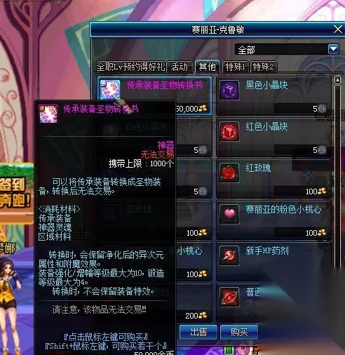 赖得做的可以拍卖直接买圣物或者传承,传承可用赛利亚商店出售的转换书进行转换(转换之后无法交易)