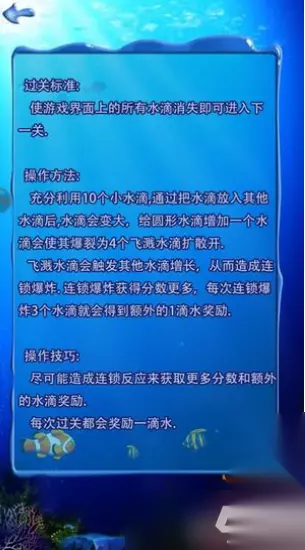 以上就是十滴水手游当中的玩法介绍,充分利用10个小水滴,通过把水滴放入其中水滴后,水滴会变大,给圆形水滴增加一个水滴使其爆裂为4个飞溅水滴扩散开。还有多种尝试的玩法,让这个水滴逐步的变大,而且还会出现不同的连锁反应;希望以上内容能够帮助各位更好的进行游戏!