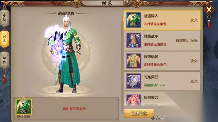 逍遥派弟子的门派时装就如他们的门派特性和行事风格一般风度翩翩,是江湖中的“文者”,相信一定有很多性格谦和随心而行的侠士喜爱这套“逍遥锦衣”。