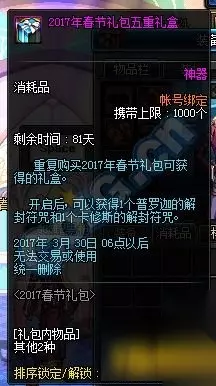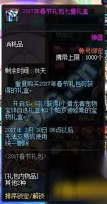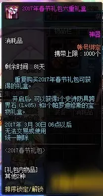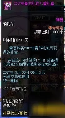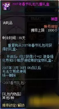 dnf2017春节套多买多送活动是怎么样的呢?本文小编为您带来dnf2017春节套多买多送活动介绍 2017春节套多买多送有什么,希望能够给您带来帮助。 【2017春节礼包多买多送】 2017春节礼包多买多送10阶段,购买第11套只赠送1个帕罗迪修斯的宝物礼盒 购买第二套赠送1个梦幻克隆装扮套装礼盒&1个普罗迦的封印武器袖珍罐礼盒