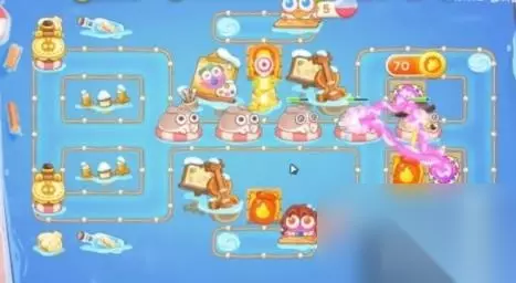 2、来到中期我们将炮塔往前推,在地图中布局大量的火瓶炮和电磁炮基本可以成功;