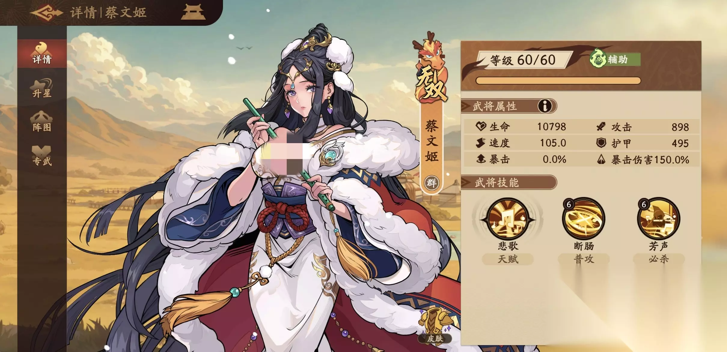 三国杀武将觉醒蔡文姬怎么搭配?蔡文姬虽然是辅助,但是她的技能效果极为出色,也被很多玩家作为核心去培养,具体情况一起往下看。 《三国杀:武将觉醒》蔡文姬搭配攻略 蔡文姬这个武将之所以重要,是因为她是一个拉条型的辅助,很多新手玩家对辅助的理解仅存在于提高伤害防御或者是加血等方面。但是拉条是无论pve还是pvp都很重要的位置,一个好的拉条角色,可以在关键时候让全队先于对方出手,这也是蔡文姬最有竞争力的地方。 蔡文姬属于伤害加成型拉条,自身大招可以给任意目标添加使其增加15%攻击力,使我方全体行动提前30%。在天赋的影响下,释放大招,还可以给敌方全体施加悲歌,使其受到的伤害提升。利用这些技能效果在阵容搭配方面有多种可选项,首先是可以选择走野兽召唤队。具体人选是蔡文姬、李垒、鲍立、韩眉和黄月英。其中蔡文姬需要做到队伍中的第一速,在蔡文姬拉条之后,可以实现三个野兽快速召唤入场。这样使得召唤兽优势能够第一时间体现出来,非常犀利。 除了召唤队之外,还可以选择以蔡文姬核心,搭配何太后、夏侯氏、周瑜和关羽。其中蔡文姬专武可以选择周郎顾曲或者是动员,锦囊推荐选择高速散件,因为为要达到第一速,这是必要的牺牲,是阵容中的提速工具人。队伍中的二速选择何太后,何太后专武推荐碎盾,前期也是选择高速锦囊,和蔡文姬一起组成队伍中的强大推手。为了就是在后期能够真正保证队伍率先出手,克制对方的拉条。夏侯是打火工具人,周瑜和关羽当然是队伍中的核心输出,在辅助的加持之下,这二人可以率先出手,快速清理对方。