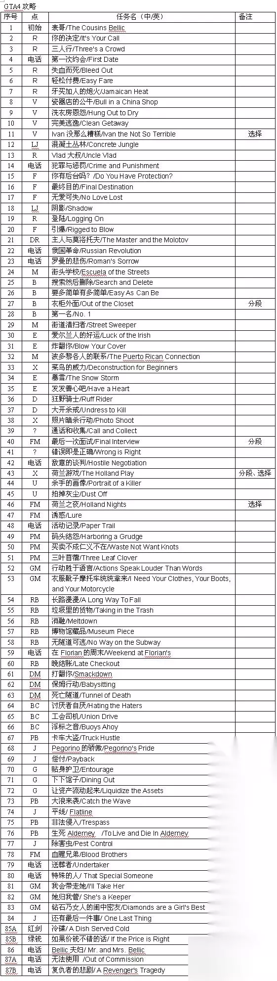 GTA4全主线任务流程图文攻略 主线任务列表: