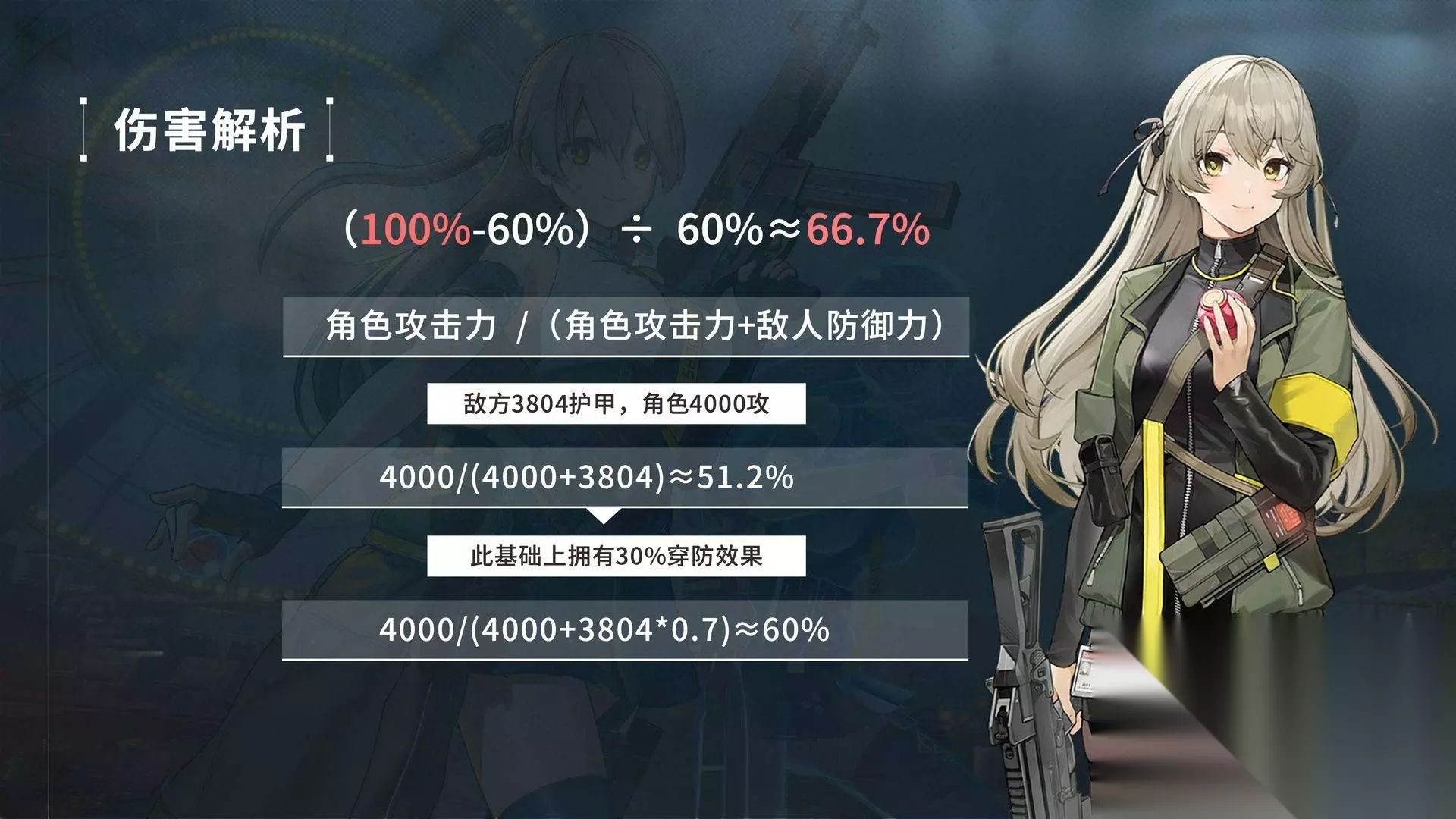 至于为什么,这就要谈到少前2最关键的穿防乘区了。 穿防乘区 穿防乘区,也就是角色造成的实际伤害。 以敌人3804护甲为基准,如果你有4000攻,那么造成的实际伤害约为51%; 如果在此基础上拥有30%穿防效果,那么实际伤害将会提升到约60%别看穿防率只提升了9%,但是总伤害却提升了约17.6%