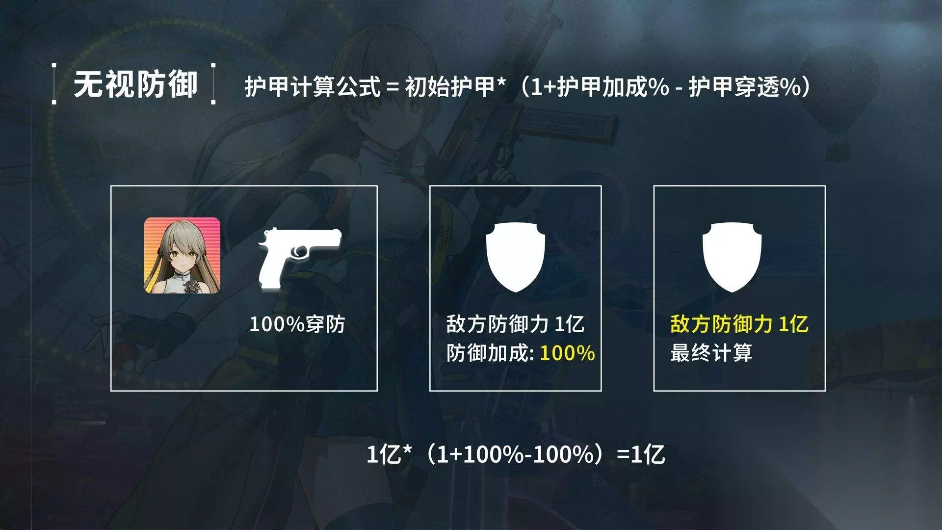 可如果敌方在有1亿护甲的同时,拥有100%的护甲加成buff,那么100%无视防御的效果; 会和100%的护甲先加成进行加法计算之后,再剩1亿护甲。