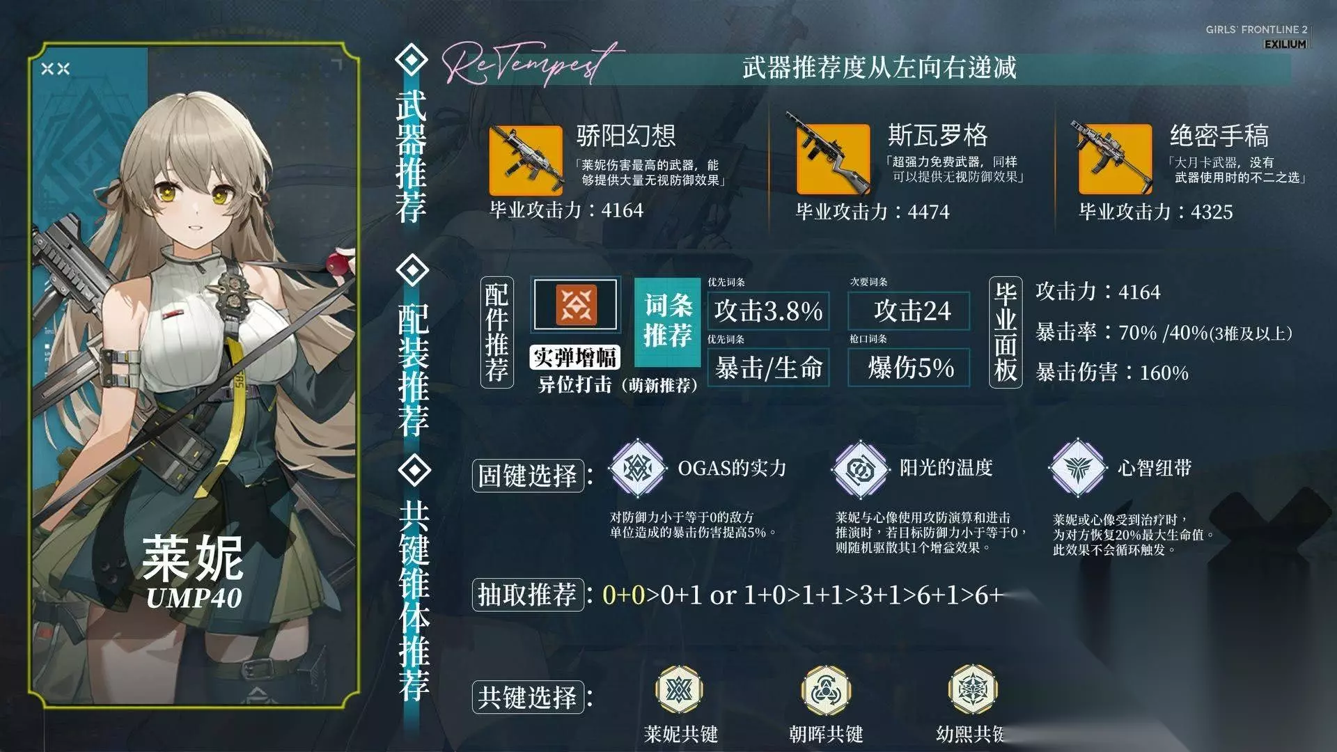 最后一个重头戏是探索活动。 这次的探索将为大家提供大量的资源回收机会,毫无疑问,将为你的角色强化和装备提升提供丰厚的支持。 想要快速提升战力的玩家,千万不要错过这一活动。 《少女前线2:追放》莱妮角色攻略 抽取建议 首先就是角色的抽取建议,对于想要玩物理队的指挥官们,推荐0+0作为队伍的副c兼辅助上场。 后续如果想要继续提升,可以抽取专武或一椎,具体的优先度,我会在后面进行详细说明。 不过由于现在物理队还没有完全成型,也可以未来可期未来抽~
