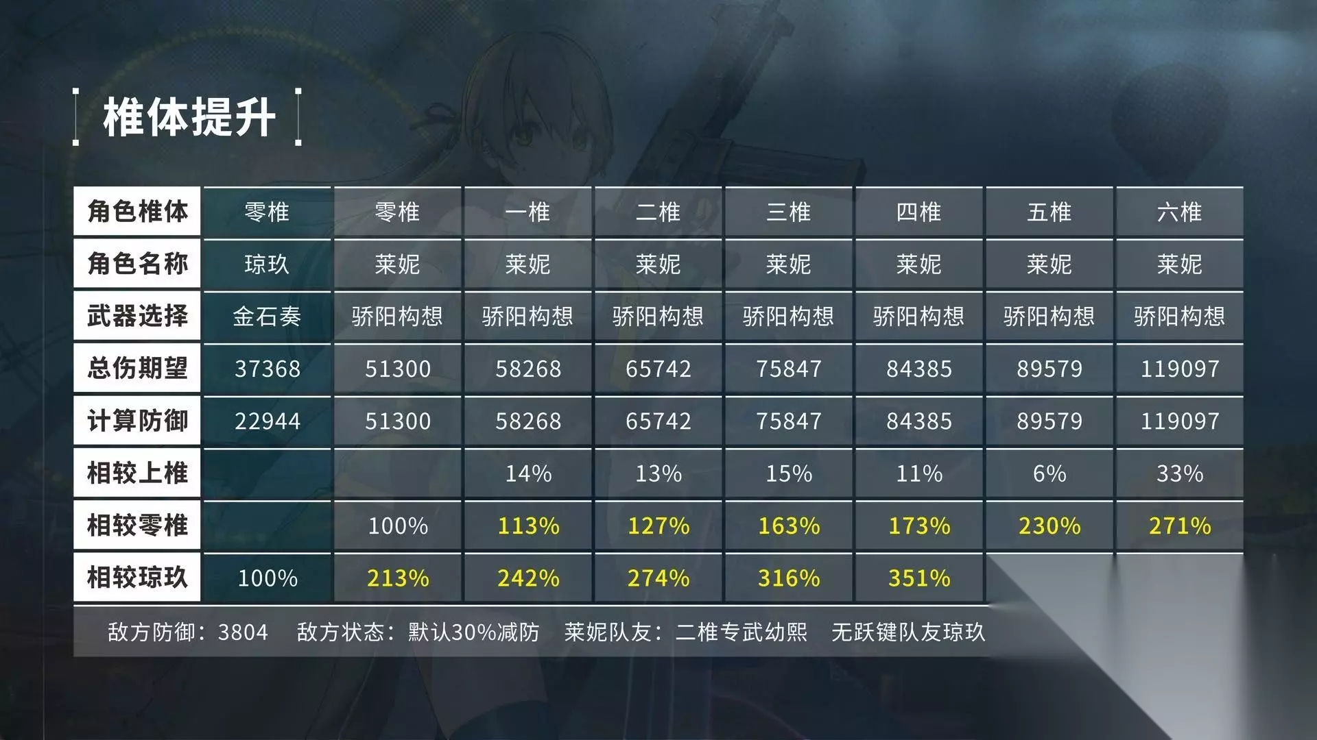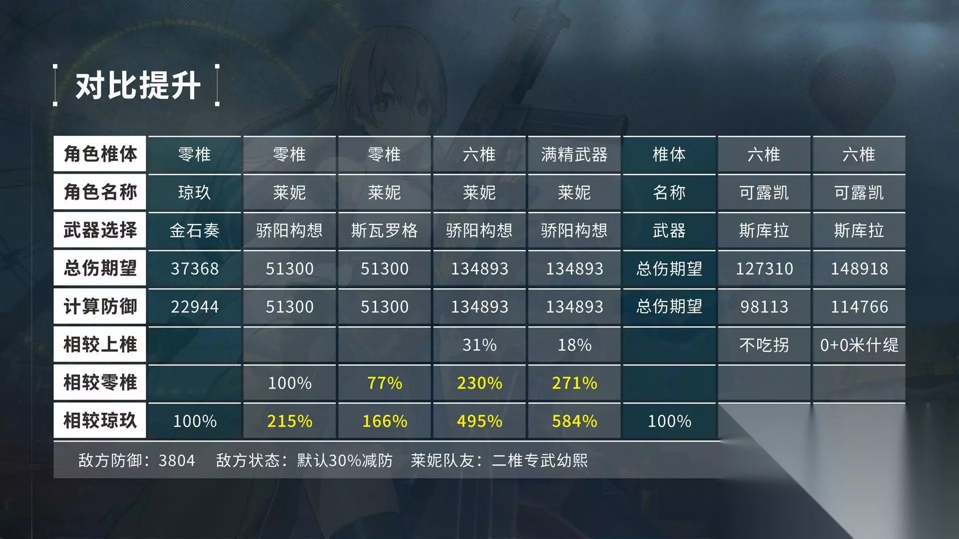 莱妮6+6由于能够刚好达到常驻额外200%无视防御,提升幅度可以说是继春田专武之后满精提升第二大的专武了。