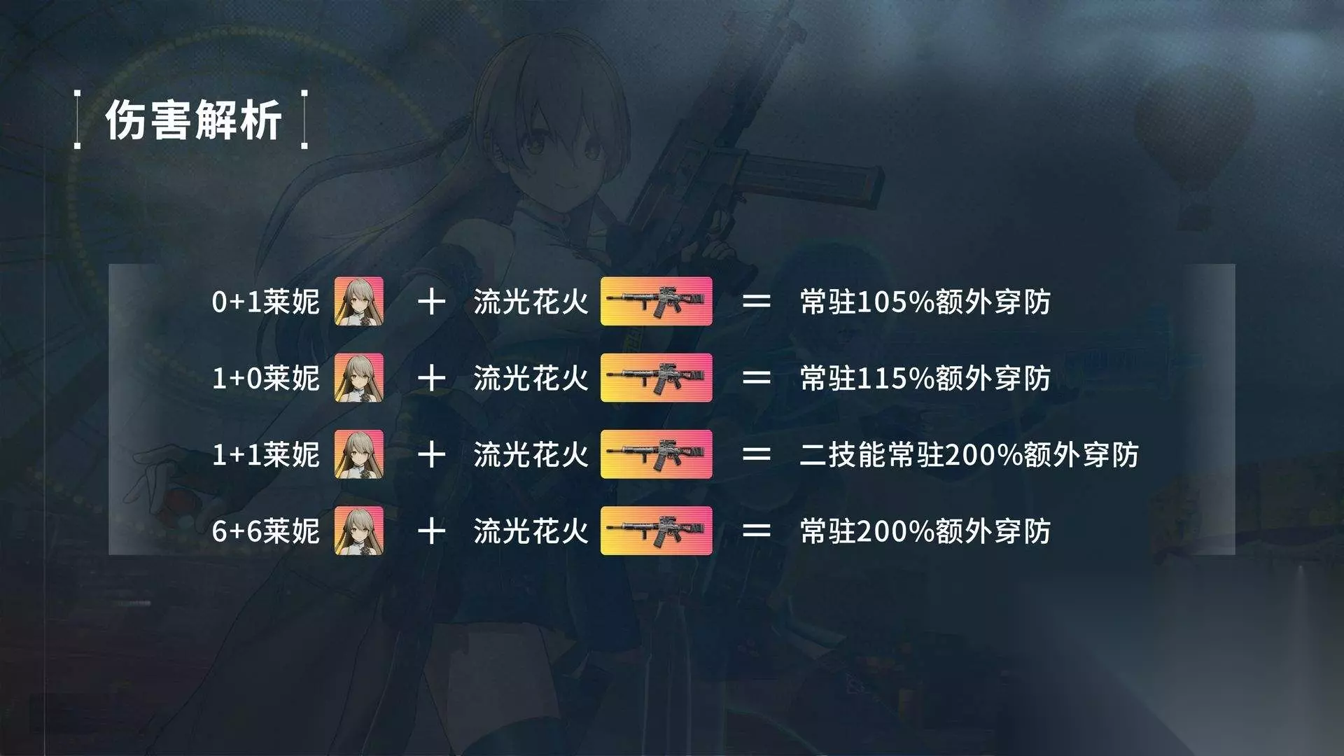 伤害解析: 角色总评,在无任何环境buff的情况下,6+1莱妮的伤害只比6+1妮基塔略低; 莱妮在对抗高防御boss时有很大优势,但是在现在的尘烟前线表现不佳; 如果在未来推出针对性的高甲会战boss,或者取消减防buff,那么莱妮风评就会反转了。