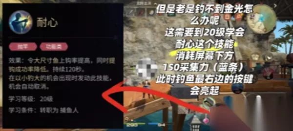 但是老是钓不到金光怎么办呢,这需要到20级学会耐心这个技能,此技能消耗屏幕下方150采集力(蓝条)持续时间120秒,秒数在血条上方状态栏可以看到