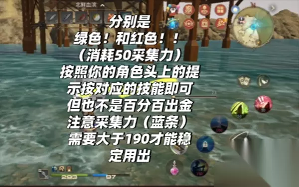此时钓鱼最右边的按键会亮起分别是 绿色!和红色!!(消耗50采集力)按照你的角色头上的提示按对应的技能即可 但也不是百分百出金,本人有过120秒一次金都没出过,注意采集力(蓝条)需要大于190(150+50)才能稳定用出,或者用耐心旁边的药剂(自己设置,1000一瓶,想好要不要用)