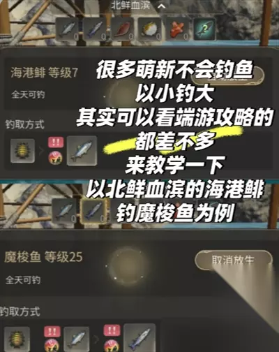 以小钓大的条件是需要用前一次的大尺寸鱼(海港鲱)才能钓起目标鱼(魔鬼梭),普通海港鲱是不行的 注意看钓起来的光是金色的就是大尺寸鱼(也可以叫优质鱼HQ品质),此时屏幕边的以小钓大就亮起来了,继续点击以小钓大就可以了