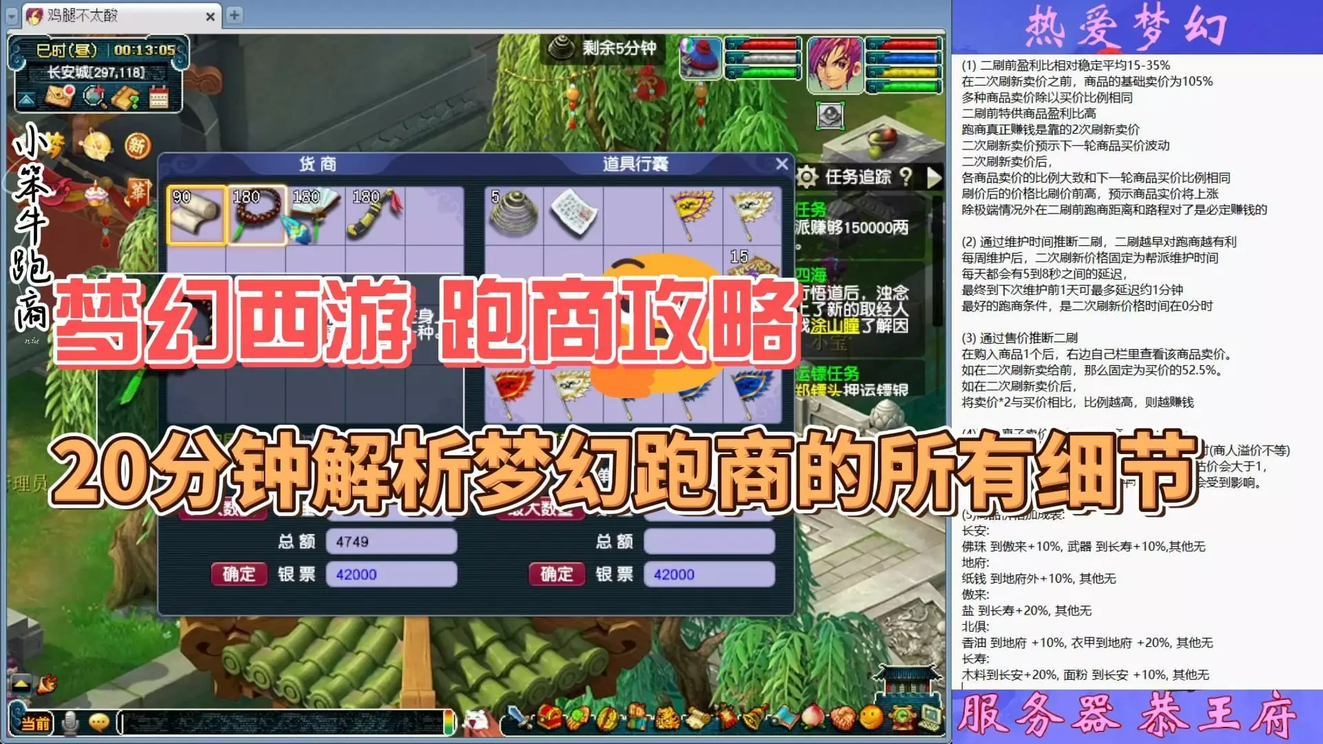 2.接取跑商任务需要满足哪些前提条件? 加入帮派:你必须先加入一个帮派。前往长安城(坐标383,259)找到帮派主管,申请并成功加入一个帮派是第一步。 获取商人职位:进入帮派后,找到白虎堂总管。如果你已有50点帮贡,可以直接申请成为商人;若帮贡不足,则需要联系帮主、副帮主等管理人员为你授予商人身份。 3.具体接取任务的流程是怎样的? 第一步:与白虎堂总管对话。在帮派中找到白虎堂总管,与其交谈。 第二步:领取任务。点击对话框中的“给我些任务”选项。 第三步:选择初始资金(部分等级适用)。对于100级以上的玩家,通常会提供两种初始资金选择,例如42000两或52000两;100级以下的玩家则直接领取系统分配的初始资金。领取成功后,你的物品栏中会出现一张“帮派银票”,其上会显示当前资金和任务目标金额。 4.接任务时有哪些关键注意事项? 当帮派资金显示为黑色时跑商,通常能获得双倍帮贡奖励;若资金为粉色,则奖励减半。选择合适的时机接任务能让收益最大化。 利用帮派内商品:接取任务后,可以先在帮派内查看是否有商品可购买,例如长寿村的商品,若有则可直接购买后前往长安出售,这是一个快速获利的技巧。 5.接完任务后,新手应该如何开始第一步? 任务接取后,你就正式开始了跑商之旅。首先需要熟悉几个基本商人的位置:长安、地府、傲来、长寿村、北俱芦洲,每个场景通常有商人和货商两位NPC,他们的商品价格可能不同,注意比价。对于新手,建议优先选择较为简单的路线,如长安与地府之间,或长安与长寿村之间进行商品倒卖。 6.如何高效利用接任务后的初次操作? 首选帮派内购买:如果帮派内刷出了如面粉、商品符或鹿茸等长寿村商品,应优先购买,然后直接到长安商人处出售,利润通常比较可观。 无合适商品则启程:若帮派内没有合适商品或价格不理想,便应立刻动身前往其他场景。 7.跑商过程中有哪些常见的误区需要避免? 交票时未清空商品:当银票资金达到任务要求时,务必记得将身上剩余的商品全部卖出后再交票,否则这些商品会被系统清空,造成不必要的损失。 8.成功接取并开启跑商的关键点 成功接取跑商任务的核心在于:首先确保已加入帮派并拥有商人身份;其次,在接任务时留意帮派资金颜色以选择最佳奖励时机;最后,接取任务后灵活利用帮派内资源迈出第一步。掌握这些,你便能顺利开启在《梦幻西游》中的商旅生涯,逐步积累财富与帮贡。