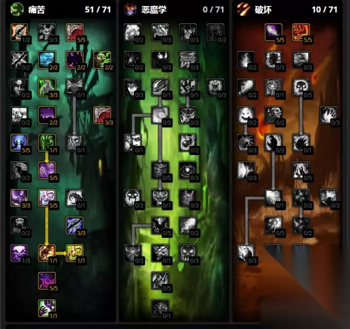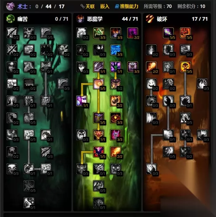 巫妖王之怒术士练级天赋推荐: 练级天赋推荐使用恶魔学识,因为该天赋树中有诸多强化自身生存和宠物能力的天赋,遇到多个怪物时也能从容面对。在危急关头,终极天赋恶魔变身还可以扭转局势。