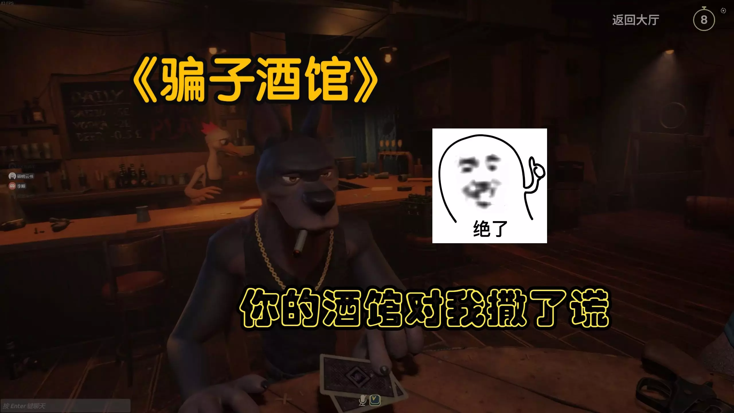 这是STEAM平台上的一款卡牌博弈游戏,游戏里玩家化身拟人化动物在酒吧场景中进行卡牌对局,质疑操作的速度比出牌还快,充满紧张刺激的博弈感。