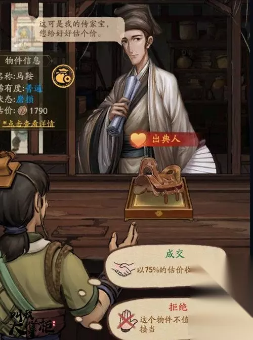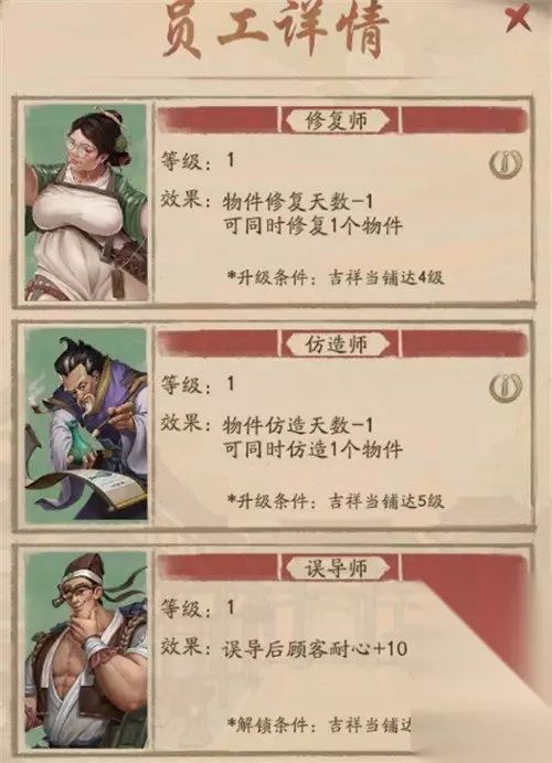 技巧三:培养伙计 在经营当铺期间,随着店铺等级的提升也将解锁更多伙计。例如:修复师可以使物件的状态等级更高,从而卖出更高的价格;包装师可对无野史的物件进行仿造,重新进行估价;推销师可以在客人失去耐心后,进行沟通恢复一定的耐心值;与此同时,对物件合理的选择修复,可以在当铺事件中获得更大的收益。此外,推销师的续命也为掌柜添加了一层保障,但不可过多依赖。