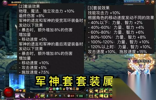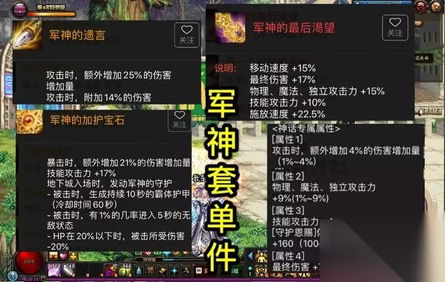 (三)特殊装备军神套(含神话耳环) (1)由于100级史诗装备,一个角色只能在“上衣,手镯和耳环”三个部位的神话装备中选择一个,横向比较后,军神套耳环部位的神话属性加成最高,所以优先选择“军神最后的渴望”神话耳环,假设神话属性完美,军神套单件可以获得29%额外黄字,14%附加伤害,21%额外暴伤,31%技能攻击力,24%最终伤害,24%三攻伤害,15%移动速度,22.5%的释放速度,加成相当暴力。