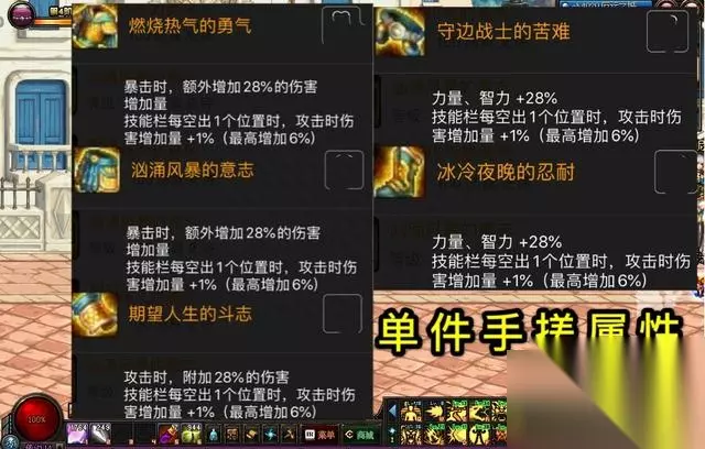 (2)套装属性方面,三攻10%,最终伤害10%,额外暴伤8%,技能攻击力10%,力量智力10%。