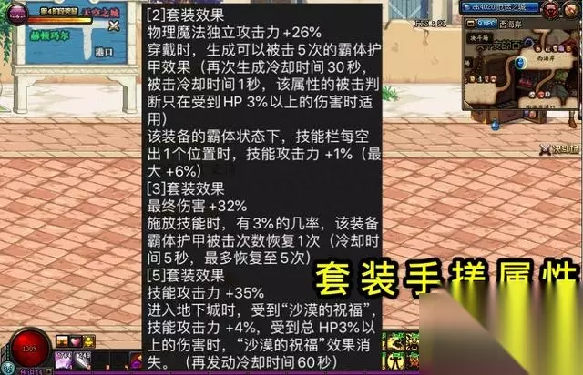 (2)再看套装属性,非常简单残暴,三攻增加26%,最终伤害增加32%,技能攻击力增加35%,霸体无伤的情况下,还可以获得10%技能攻击力提升。再把单件属性综合来看,当之无愧的100级版本最强防具。